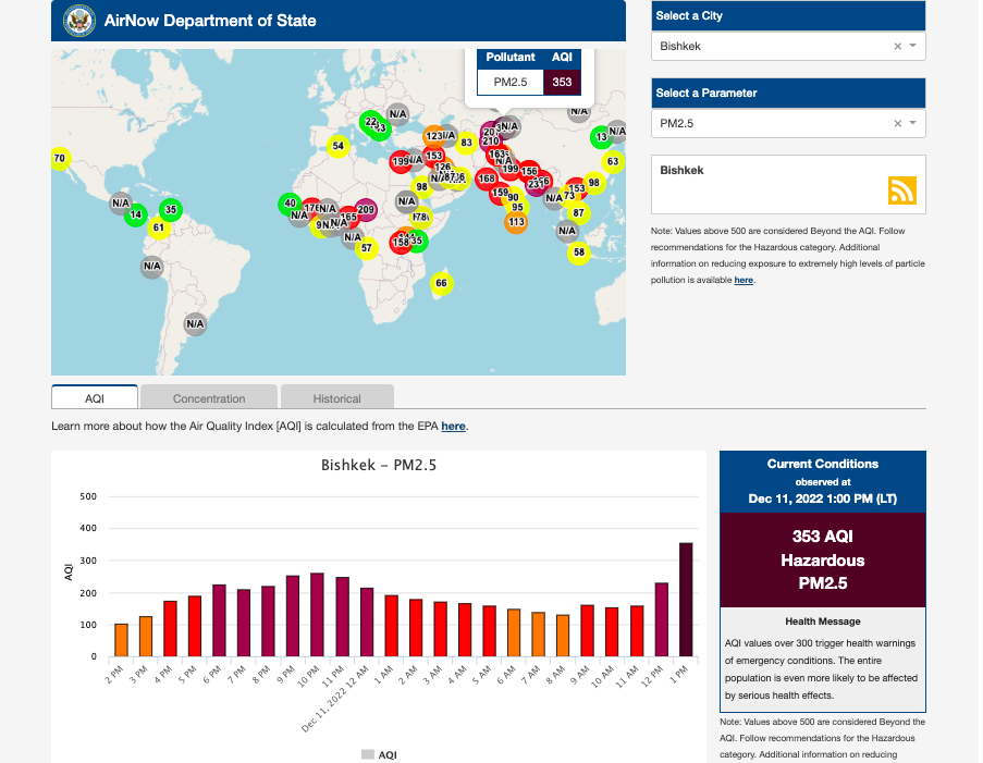 Посольство США в Кыргызстане также установило станцию. Информация обновляется каждый час. Индекс качества воздуха в районе дипломатической миссии «опасный» — 353 (AQI).