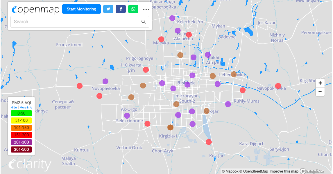 Бишкек возглавил рейтинг крупнейших городов мира World Air Quality по загрязнению воздуха. Столица Кыргызстана на первом месте с показателем воздуха как «очень нездоровый».