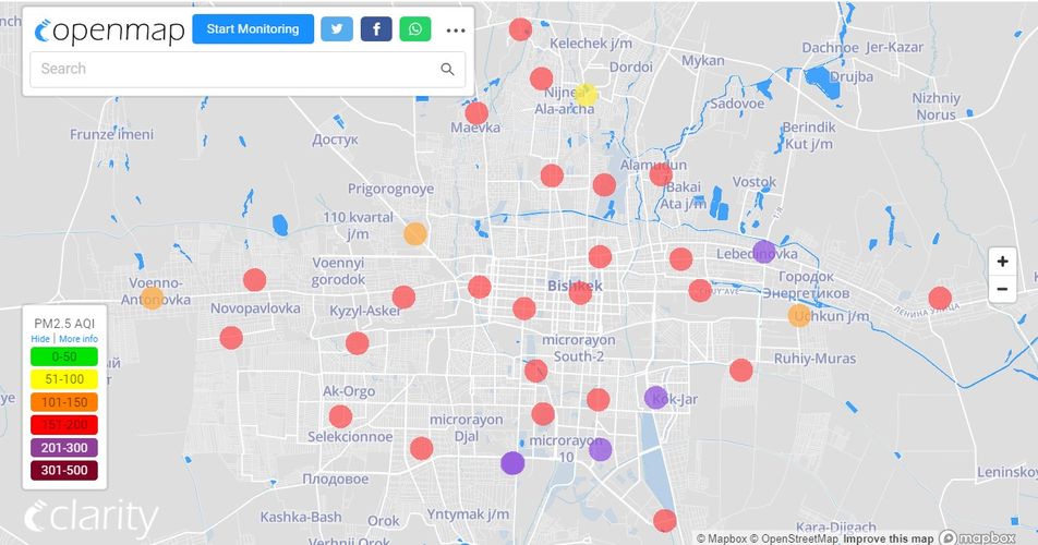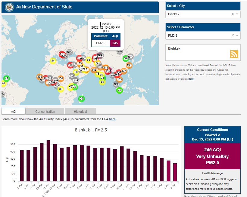 Посольство США в Кыргызстане также установило станцию. Информация обновляется каждый час. Индекс качества воздуха в районе дипломатической миссии «очень нездоровый» — 245 (AQI).