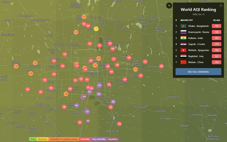 В 18.00 статус города отмечен как «нездоровый». Индекс качества воздуха, по данным сайта, составляет 169 (AQI).
