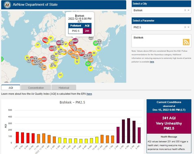 Посольство США в Кыргызстане также установило станцию. Информация обновляется каждый час. Индекс качества воздуха в районе дипломатической миссии «очень нездоровый» — 241 (AQI).