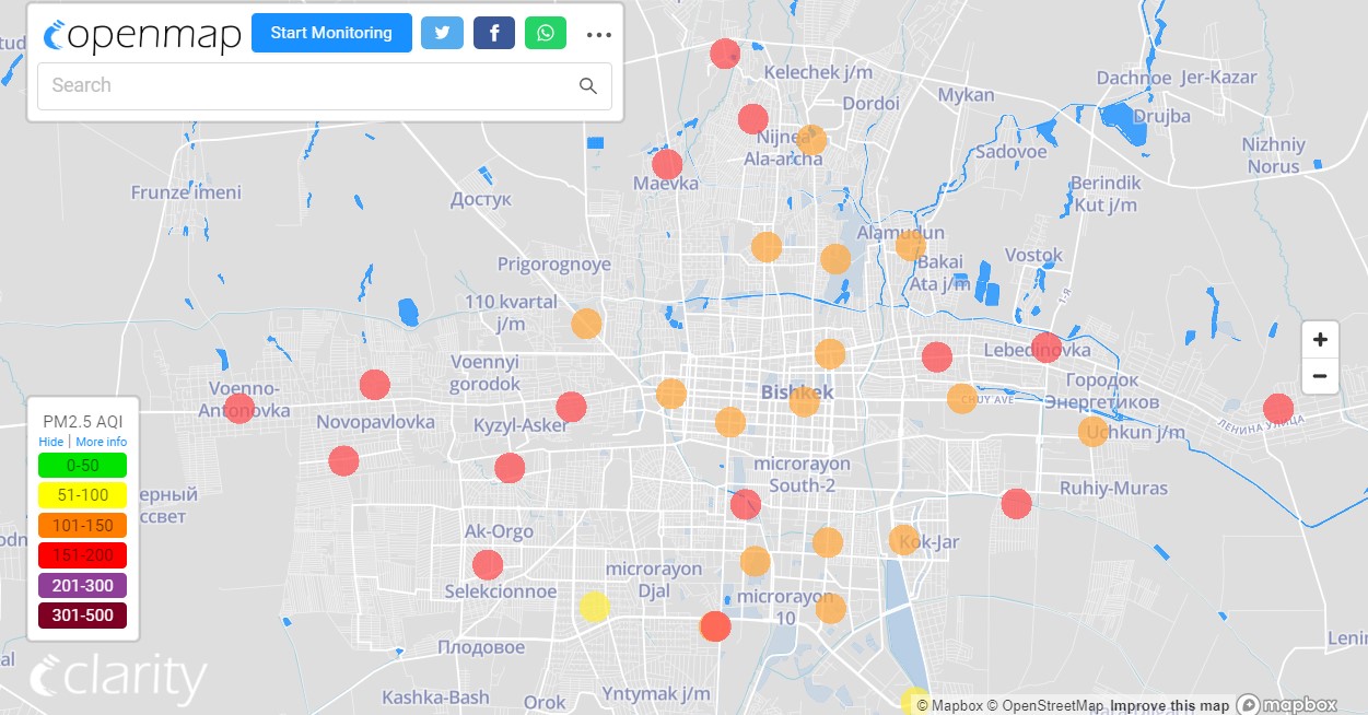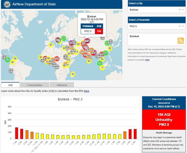 Посольство США в Кыргызстане также установило станцию. Информация обновляется каждый час. Индекс качества воздуха в районе дипломатической миссии «нездоровый» — 156 (AQI).