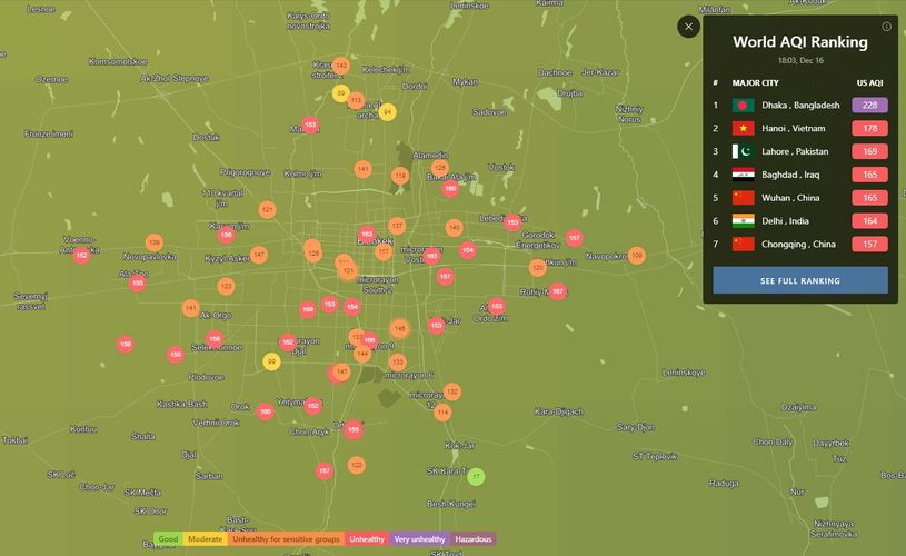 В 18.00 статус города отмечен как «нездоровый для чувствительных групп». Индекс качества воздуха, по данным сайта, составляет 147 (AQI).