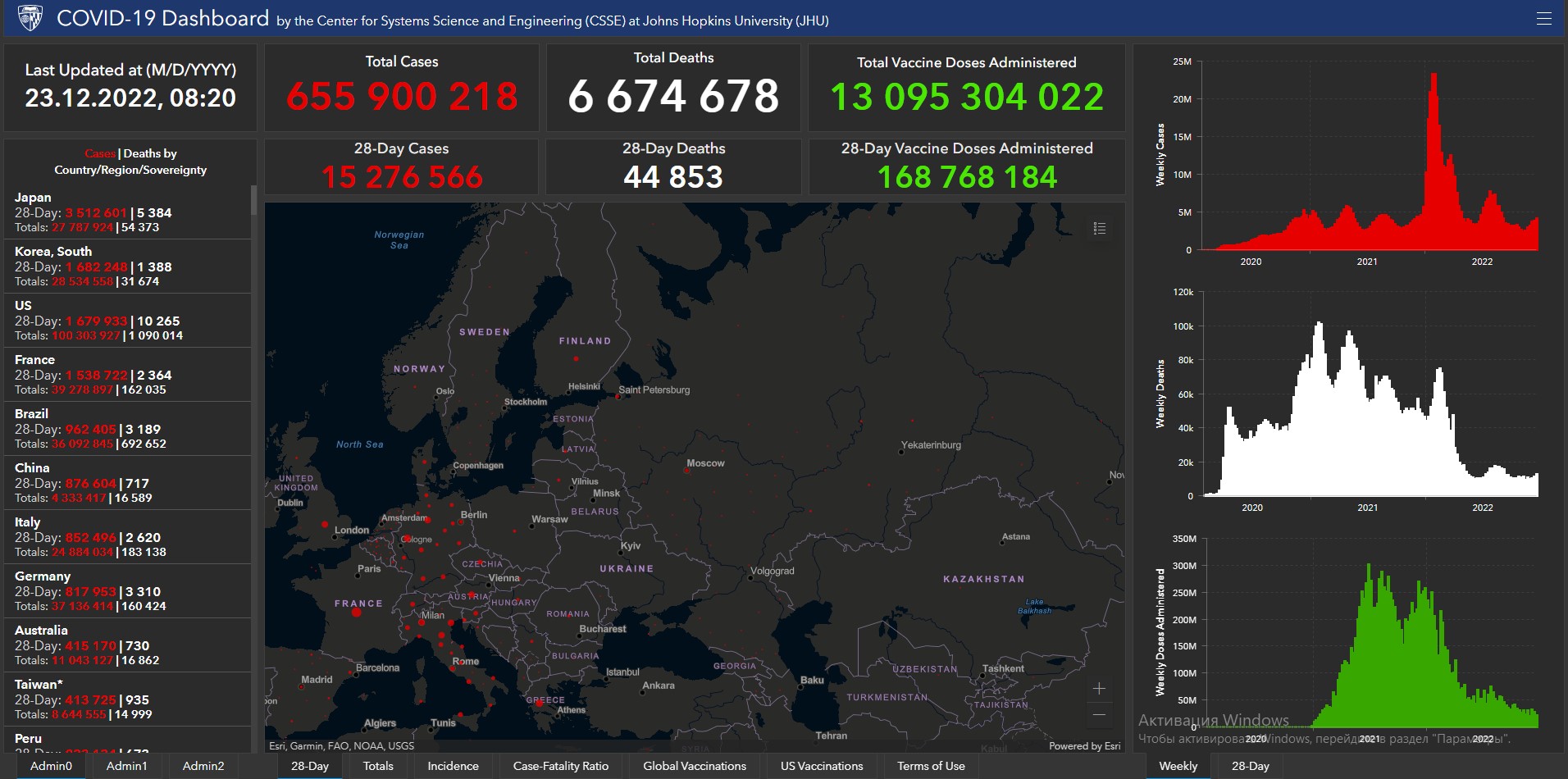 Всего в мире с начала пандемии коронавирусом заразились 655 миллионов 900 тысяч 218 человек. Больше всего в США (100 миллионов 303 тысячи 927), Индии (44 миллиона 676 тысяч 515), Бразилии (36 миллионов 92 тысячи 845), Франции (39 миллионов 278 тысяч 897), Великобритании (24 миллиона 364 тысячи 786), России (21 миллион 435 тысяч 797), Турции (16 миллионов 919 тысяч 638), Аргентине (9 миллионов 829 тысяч 236), Иране (7 миллионов 560 тысяч 667), Колумбии (6 миллионов 322 тысячи 281), Испании (13 миллионов 651 тысяча 239), Италии (24 миллиона 884 тысячи 34) и Германии (37 миллионов 136 тысяч 414).Количество смертей от коронавируса достигло 6 миллионов 674 тысяч 678. За сутки показатель вырос на 2 тысячи 554 человека. В том числе в США всего с начала пандемии скончались 1 миллион 90 тысяч 14 человек, Бразилии — 692 тысячи 652, Индии — 530 тысяч 681, Мексике — 330 тысяч 834, России — 385 тысяч 302, Великобритании — 213 тысяч 994, Италии — 183 тысячи 138.