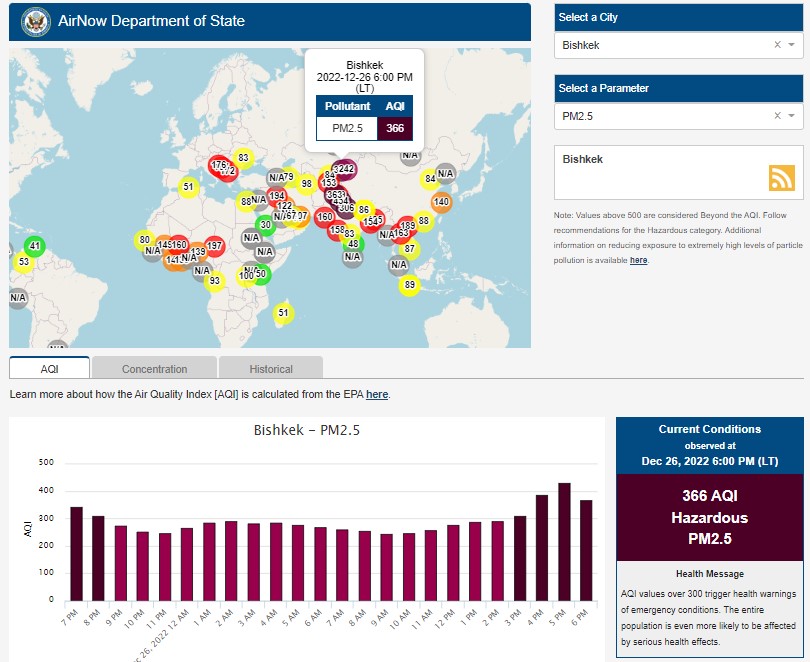 Посольство США в Кыргызстане также установило станцию. Информация обновляется каждый час. Индекс качества воздуха в районе дипломатической миссии «опасный» — 366 (AQI).