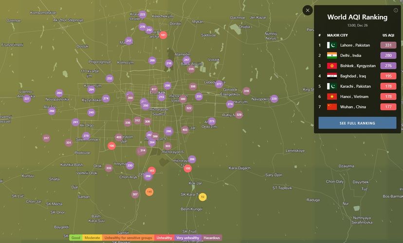 В 18.00 статус города отмечен как «очень нездоровый». Индекс качества воздуха, по данным сайта, составляет 276 (AQI).