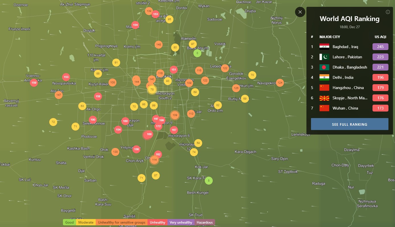 В рейтинге крупнейших городов мира по качеству воздуха World Air Quality Бишкек опустился на 23-е место.