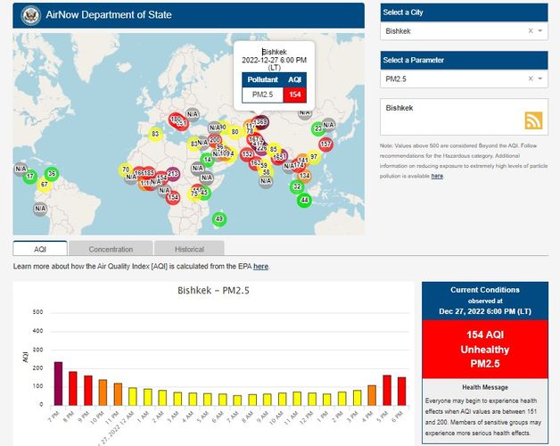 Посольство США в Кыргызстане также установило станцию. Информация обновляется каждый час. Индекс качества воздуха в районе дипломатической миссии «нездоровый» — 154 (AQI).