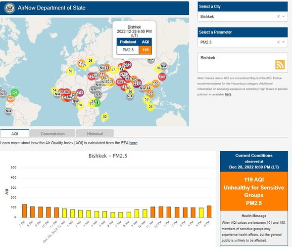 Посольство США в Кыргызстане также установило станцию. Информация обновляется каждый час. Индекс качества воздуха в районе дипломатической миссии «нездоровый для чувствительных групп» — 119 (AQI).