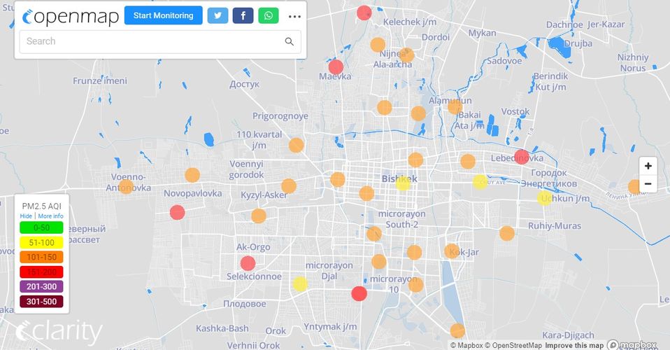 Посольство США в Кыргызстане также установило станцию. Информация обновляется каждый час. Индекс качества воздуха в районе дипломатической миссии «нездоровый» — 165 (AQI).