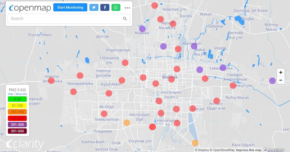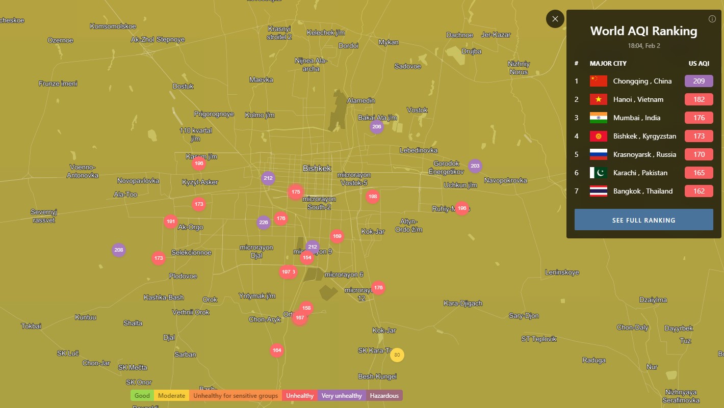 В рейтинге крупнейших городов мира по качеству воздуха World Air Quality Бишкек поднялся на 4-е место.
