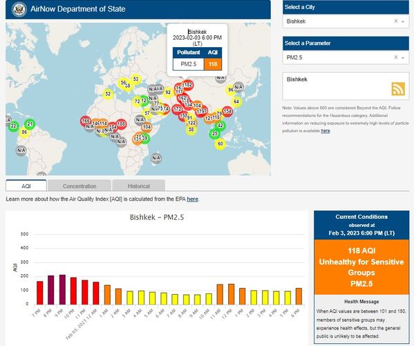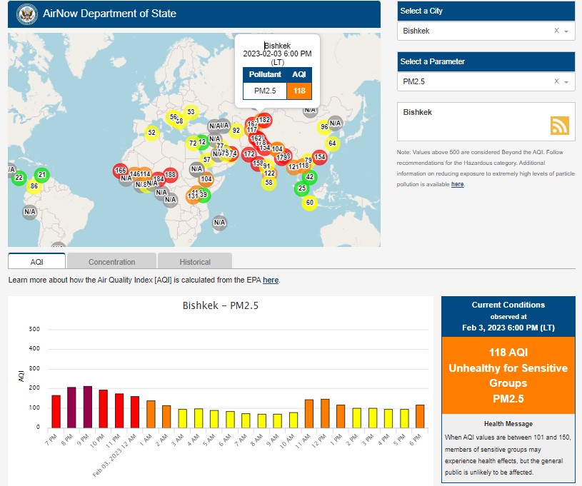 Посольство США в Кыргызстане также установило станцию. Информация обновляется каждый час. Индекс качества воздуха в районе дипломатической миссии «нездоровый для чувствительных групп» — 118 (AQI).