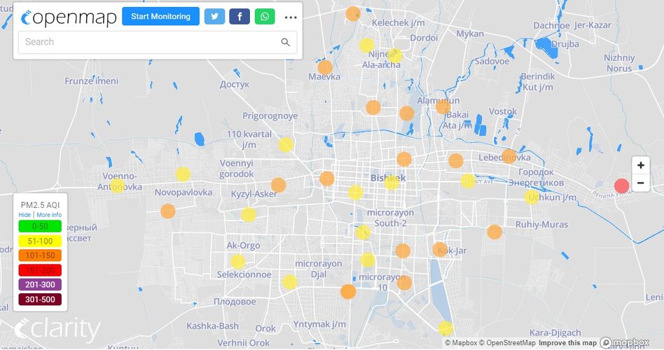 Посольство США в Кыргызстане также установило станцию. Информация обновляется каждый час. Индекс качества воздуха в районе дипломатической миссии «нездоровый для чувствительных групп» —136 (AQI).
