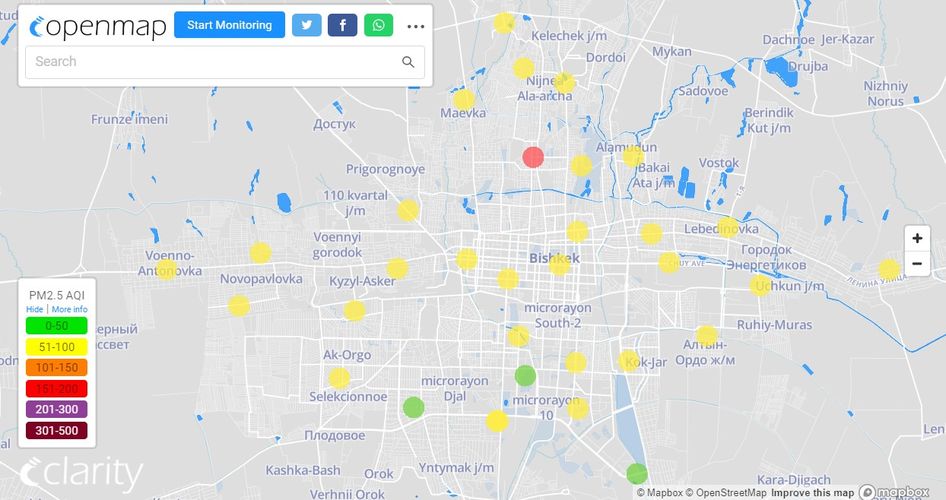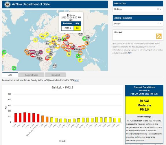 Посольство США в Кыргызстане также установило станцию. Информация обновляется каждый час. Индекс качества воздуха в районе дипломатической миссии «умеренный» — 80 (AQI).