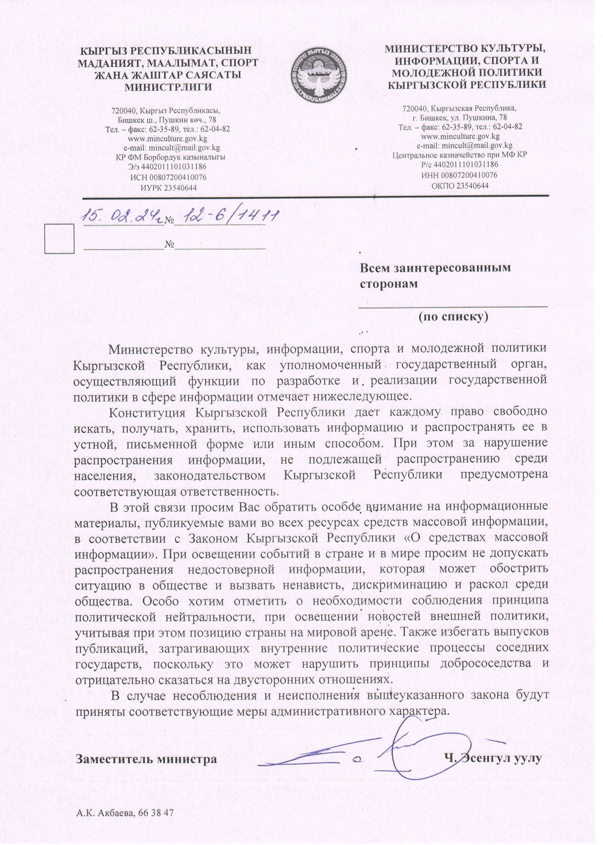Министерство культуры, информации, спорта и молодежной политики разослало письмо в СМИ за подписью замминистра Чынгыза Эсенгул уулу.