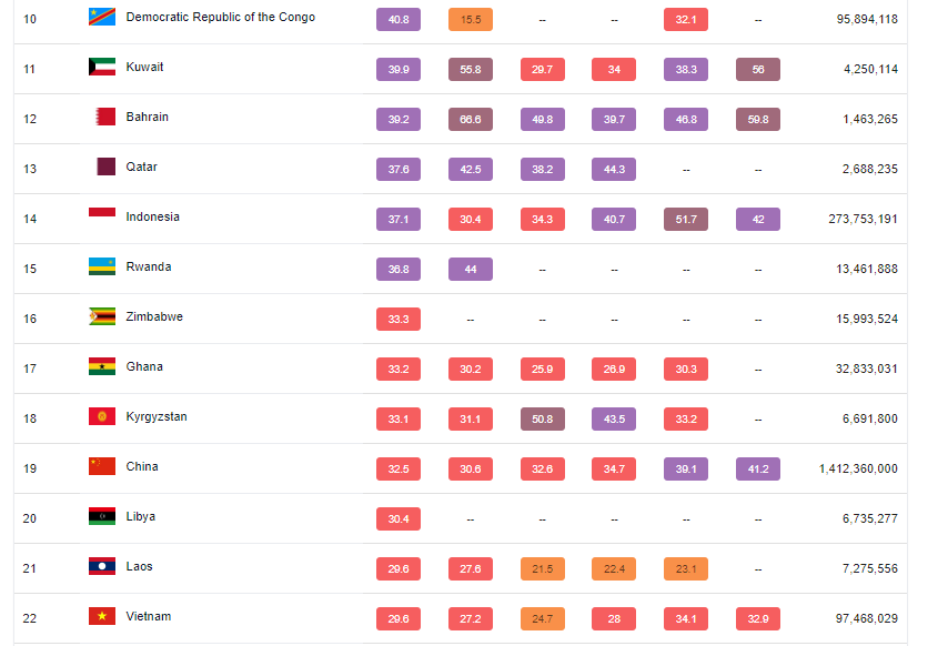 Самый чистый воздух был во Французской Полинезии, Маврикии, Исландии, Гренаде, на Бермудах, в Новой Зеландии, Австралии, Пуэрто-Рико, Эстонии и Финляндии.
