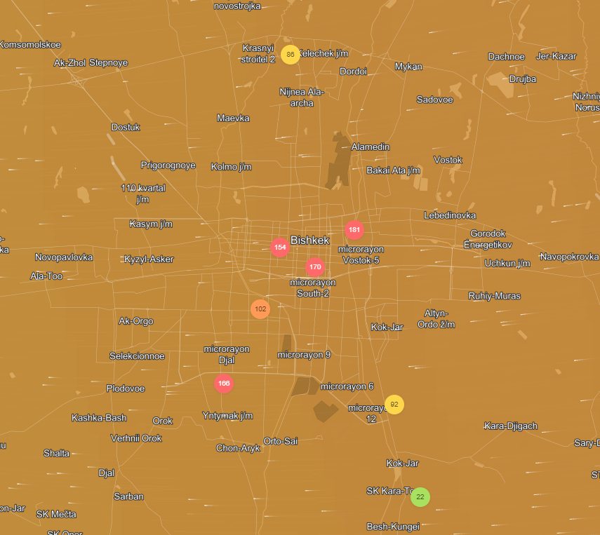 Индекс качества воздуха (AQI) разделен на шесть категорий, указывающих на возрастающий уровень опасности для здоровья. Значение AQI выше 300 — это опасное качество воздуха, а значение ниже 50 — хорошее.Добавим, что недавно Бишкек стал лидером по загрязнению воздуха в мире. Ранее министр природы Медер Машиев заявил, что в городе смога стало меньше. По его словам, основные причины смога — это отсутствие катализаторов у 85 процентов автомобилей в стране, увеличение количества жилмассивов вокруг столицы, хаотичное, неплановое строительство и вырубка деревьев.