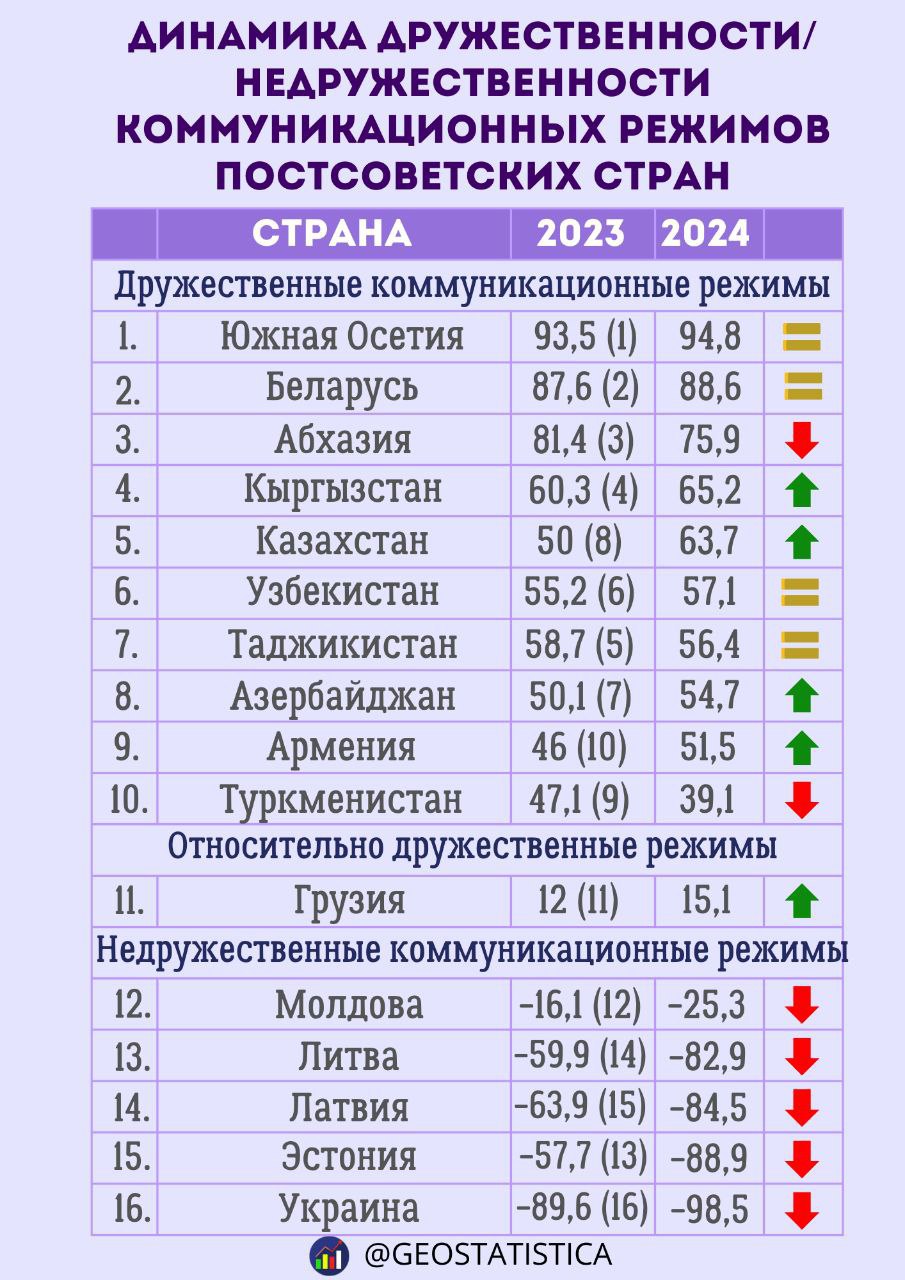 Согласно результатам исследования, позиция Кыргызстана (4-е место), Таджикистана (5-е место) и Узбекистана (6-е место) почти не изменилась, а Казахстан все еще отнесен «к патрулю дружественных, но флуктуирующих коммуникационных режимов».