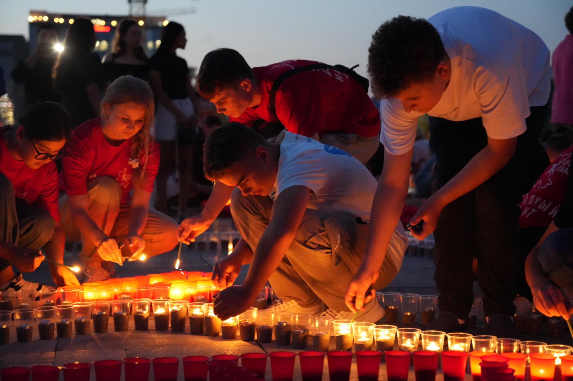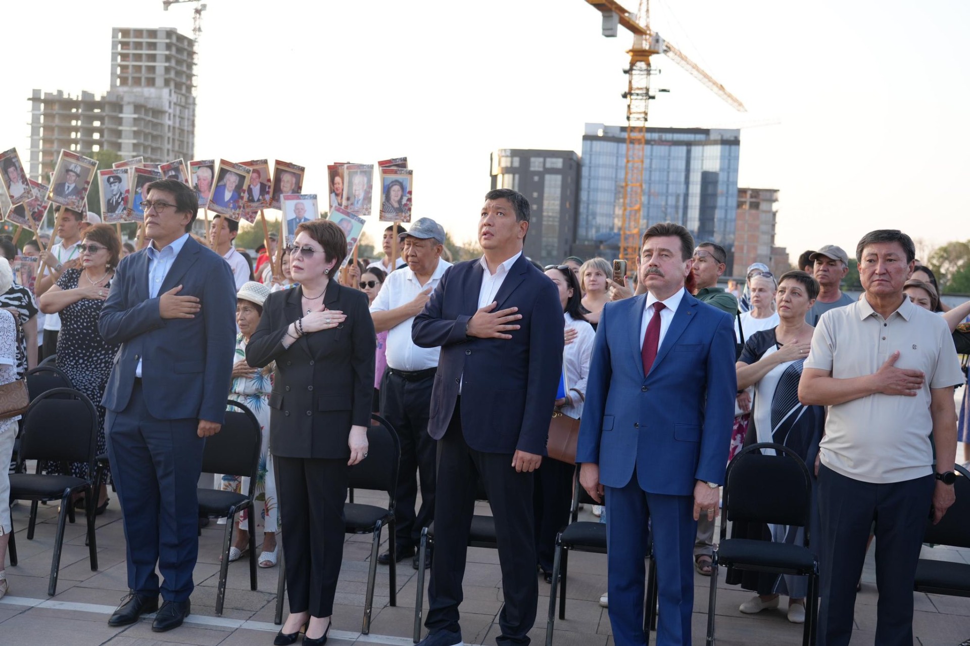 Ветераны, волонтеры, официальные лица, жители и гости составили картину из горящих свечей, которую посвятили юбилею Победы и Панфиловской дивизии, сформированной в первые дни войны в КР.