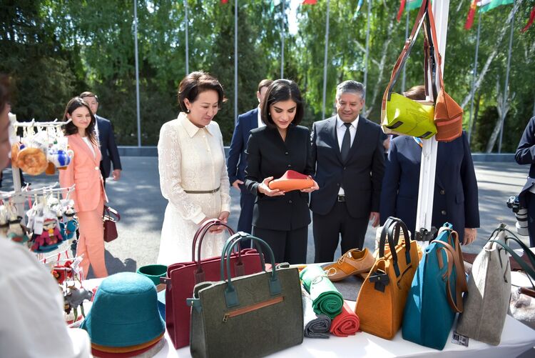 В преддверии форума «Женщина — лидер, меняющая мир к лучшему» министр труда, социального обеспечения и миграции Равшанбек Сабиров представил первой леди Кыргызстана Айгуль Жапаровой и руководителю администрации президента Узбекистана Саиде Мирзиеевой выставку талантливых кыргызстанских предпринимательниц. Об этом сообщила пресс-служба Минтруда.