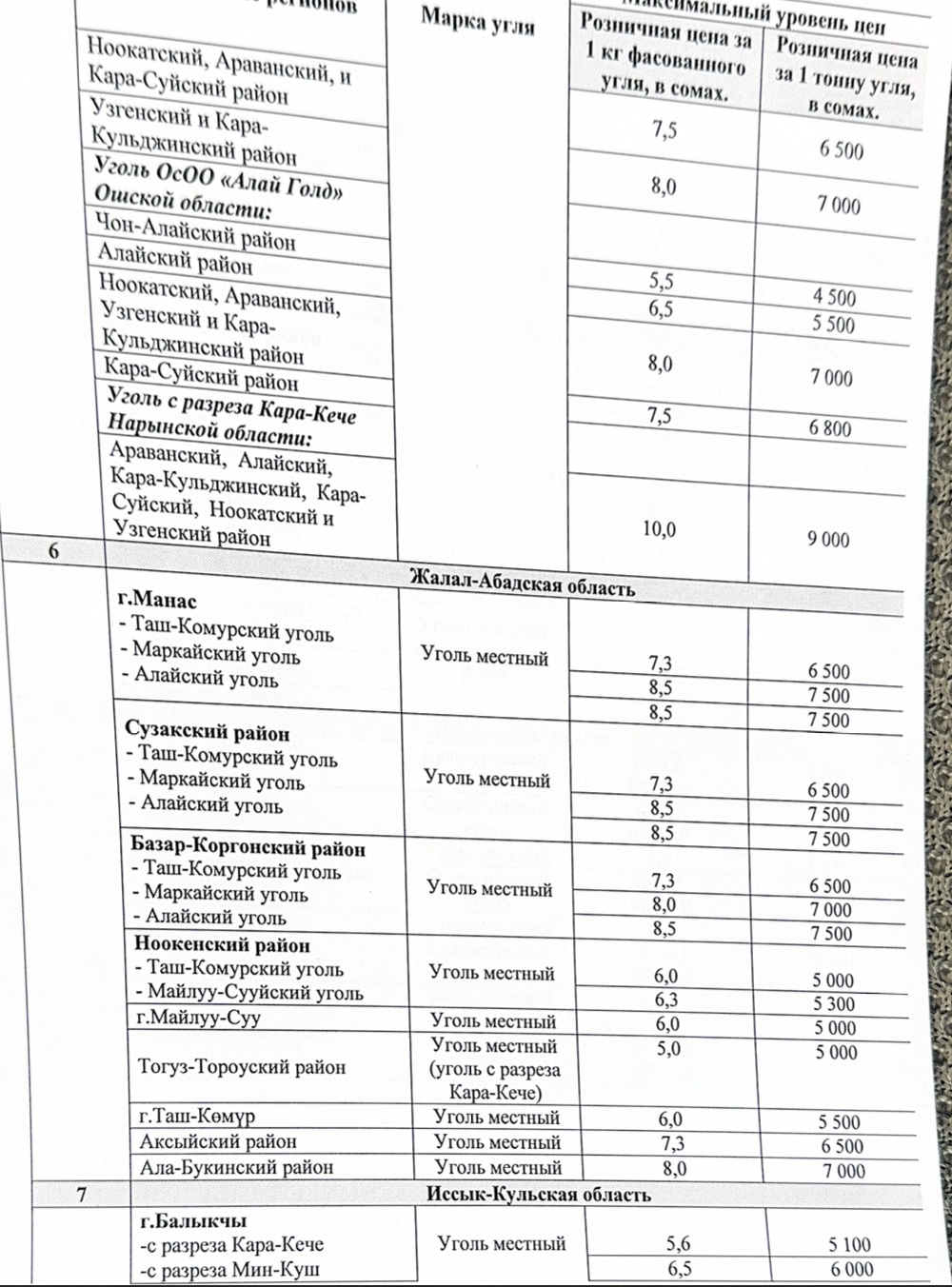 • в Чуйской области жители могут приобрести твердое топливо за 6—7,6 тысячи сомов за тонну (с разреза Кара-Кече);