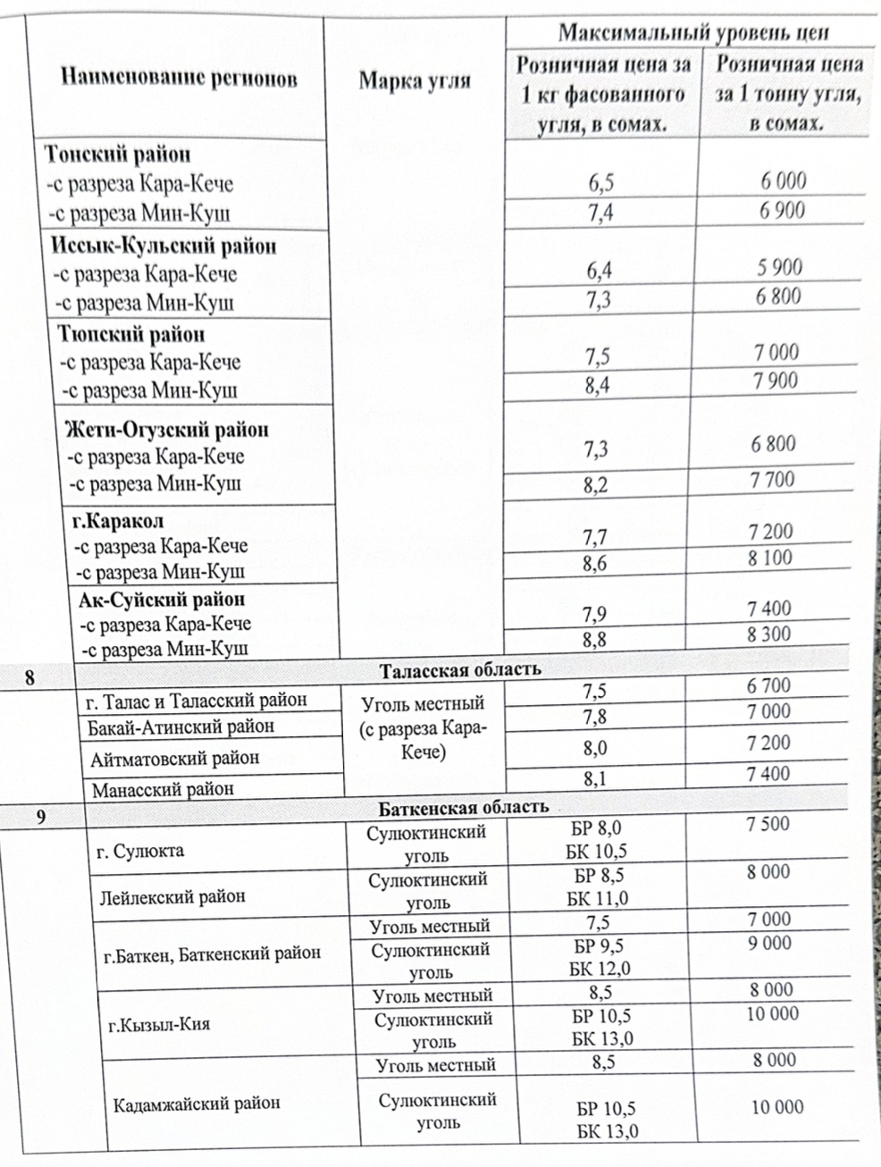 • в Иссык-Кульской области установлена более высокая цена — от 5 до 8,3 тысячи сомов за тонну угля;