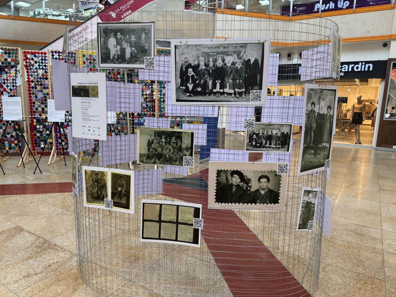 Сразу за полотном находится стенд с фотографиями, на которых запечатлены наши предки. Каждый может отсканировать QR-код с фото и перейти на специальную страницу проекта «Эсимде», позволяющую найти своего близкого родственника по имени или фамилии. Стоит отметить, что организаторы проделали большую работу, чтобы создать такую большую базу данных.