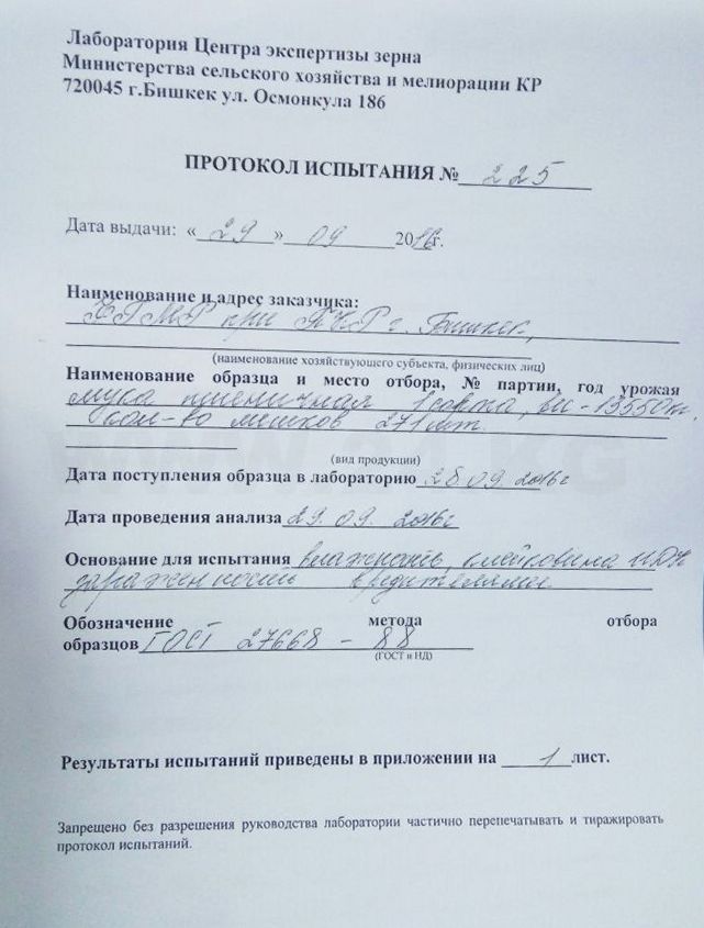 По его словам, фонд занимается обеспечением продовольственной безопасности, поэтому ведется жесткий контроль качества продукции. «Претензии к качеству муки необоснованны. Есть сертификат соответствия, протокол испытания, независимая экспертиза. Правительство не допустит, чтобы зараженная продукция попала на рынки или в учреждения. Такая мука не могла быть реализована», - сказал Жоомартбек Жумабеков.