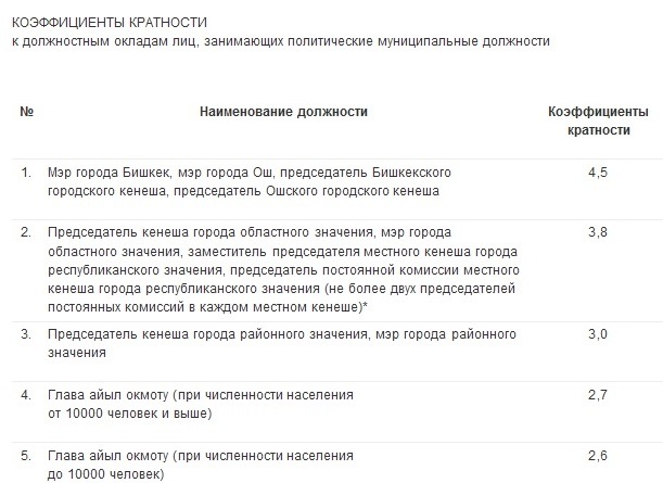 Средняя заработная плата действующих председателей постоянных комиссий Бишкекского и Ошского городских кенешей сохраняется до момента прекращения их полномочий. Впоследствии лицам, назначаемым/избираемым на указанные должности председателей постоянных комиссий Бишкекского и Ошского городских кенешей, выплачивается заработная плата за счет средств местного бюджета, основанная на применении установленных в настоящем приложении коэффициентов.