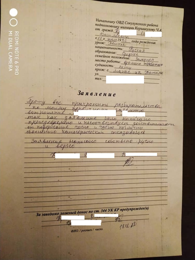 «Спустя некоторое время семья стала просить у меня 10 тысяч сомов, я отказал, ответив, что это будет считаться продажей ребенка. Связь с этой семьей на этом прервалась. Милиционерам она сказала, что забеременела от другого, а я согласен усыновить ребенка. Девочку обманули и заставили написать заявление в отношении меня», — утверждает Темирлан.