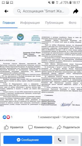 В своем ответе гражданским активистам заведующий отделом правового обеспечения Ж.Абилов напоминает, что Кыргызстан одним из первых в Центральной Азии присоединился к Всемирной декларации прав человека, которая провозглашает право человека на свободу мирных собраний и ассоциаций.