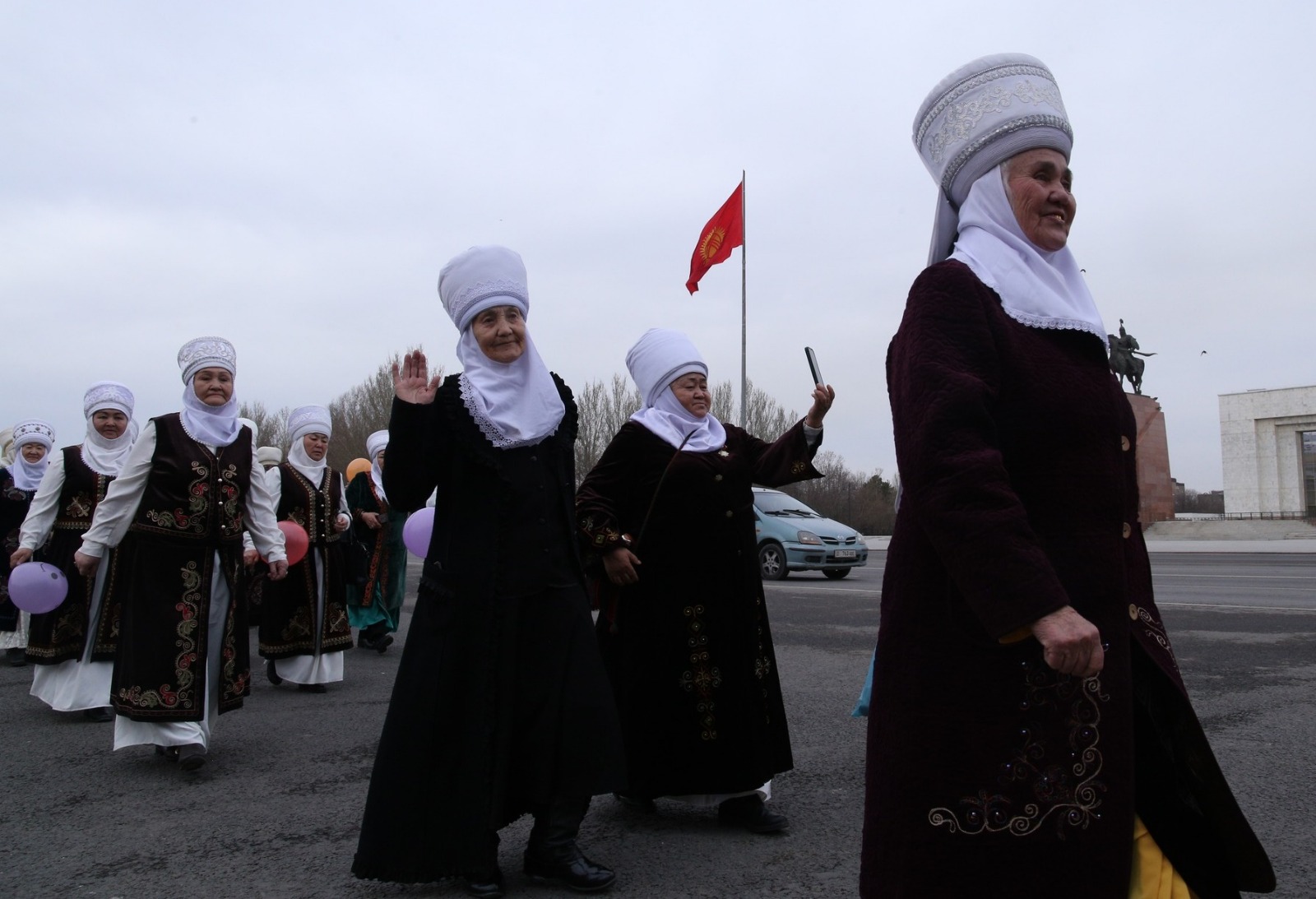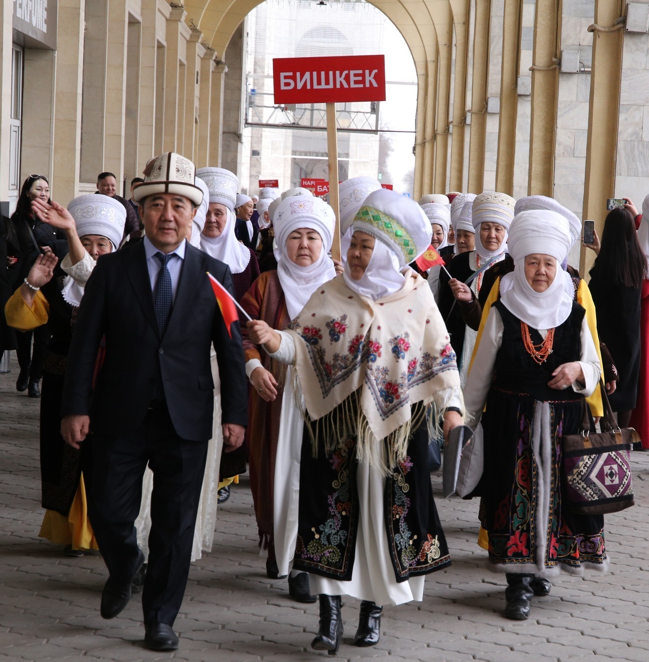 Участницы в национальных женских уборах ак элечек прошли от площади Ала-Тоо до памятника Уркуе Салиевой. В шествии приняли участие представительницы всех семи областей Кыргызстана, а также сотрудники центрального аппарата министерства труда, блогеры, поэты, писатели.