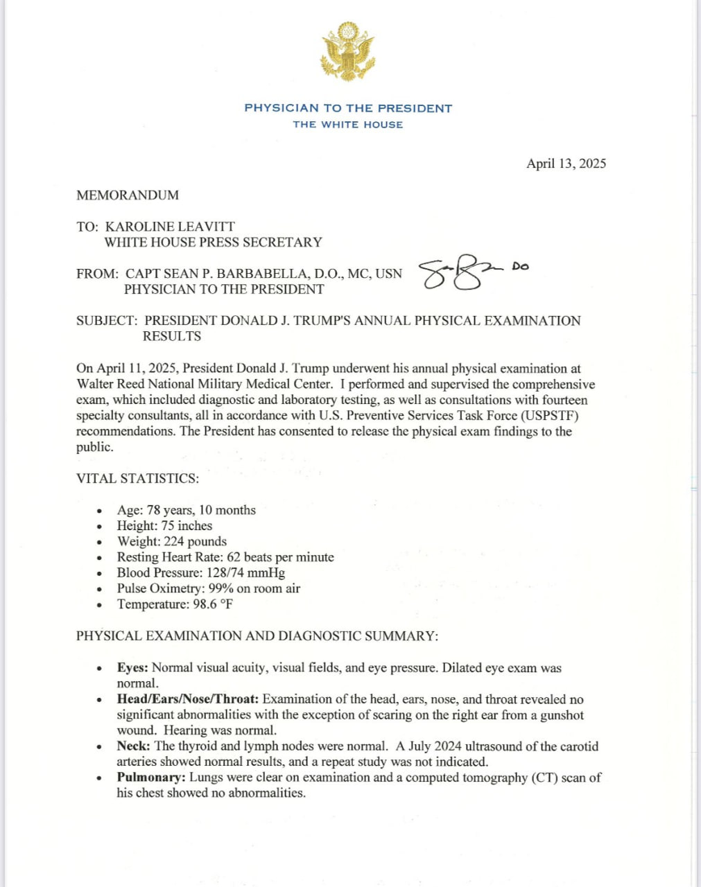 Пресс-секретарь Белого дома Кэролайн Левитт опубликовала результаты медицинского обследования президента США.