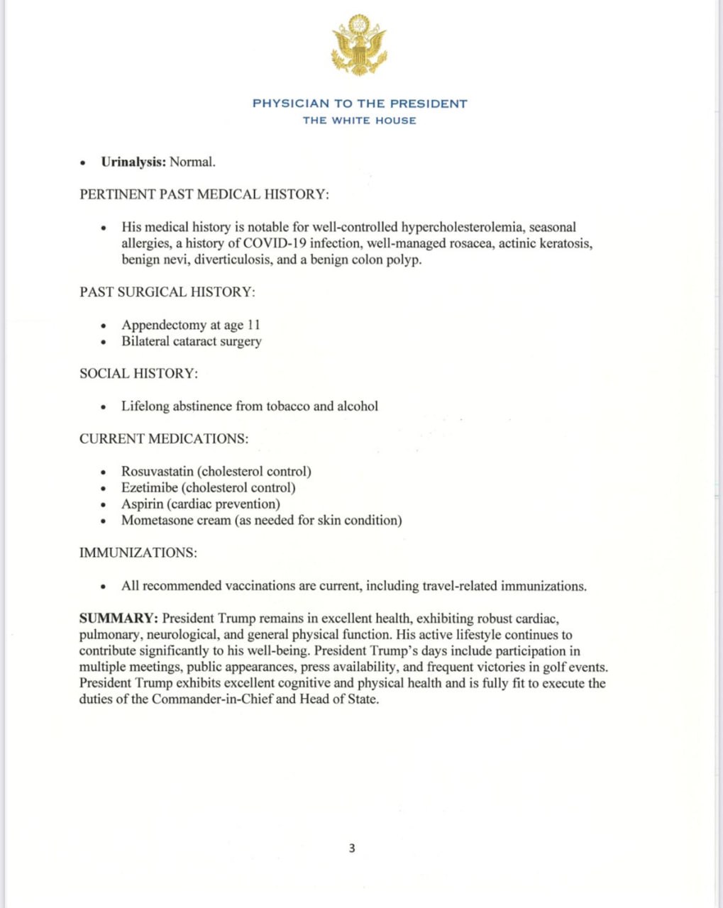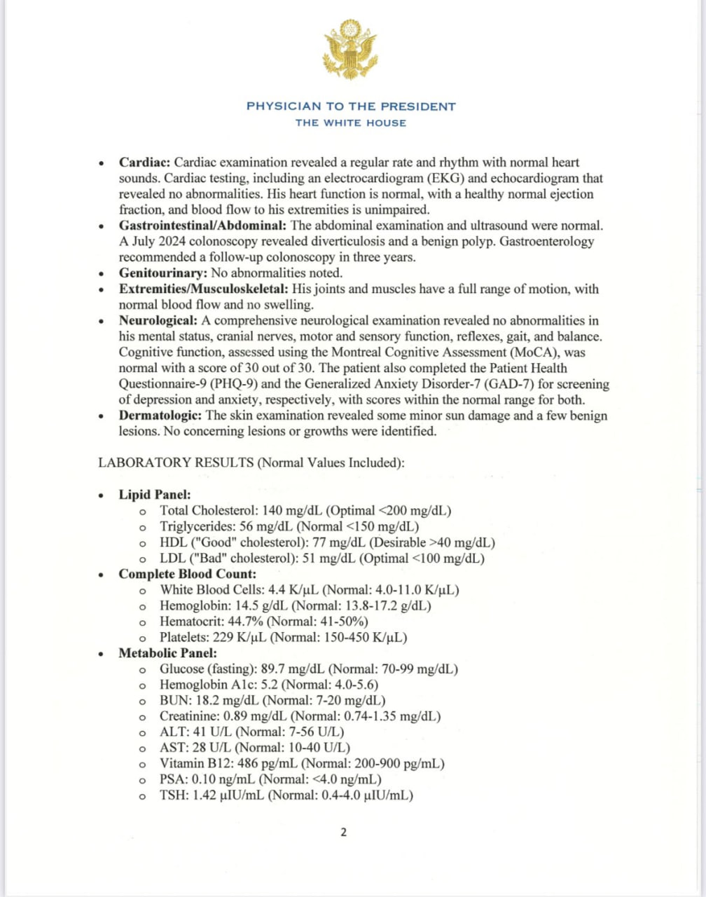 «Президент Трамп демонстрирует отличное когнитивное и физическое здоровье и полностью готов к исполнению обязанностей главнокомандующего и главы государства», — говорится в документе.