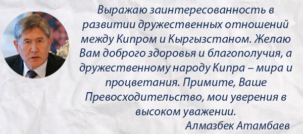 Президент Кыргызстана Алмазбек Атамбаев поздравил лидера Кипра Никоса Анастасиадиса с 56-й годовщиной независимости республики. Об этом сообщает отдел информационной политики аппарата главы государства.