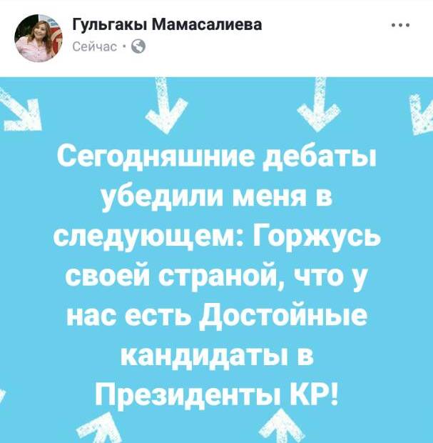 «Сегодняшние дебаты убедили меня в следующем: горжусь своей страной, что у нас есть достойные кандидаты в президенты», — написала Гульгакы Мамасалиева.
