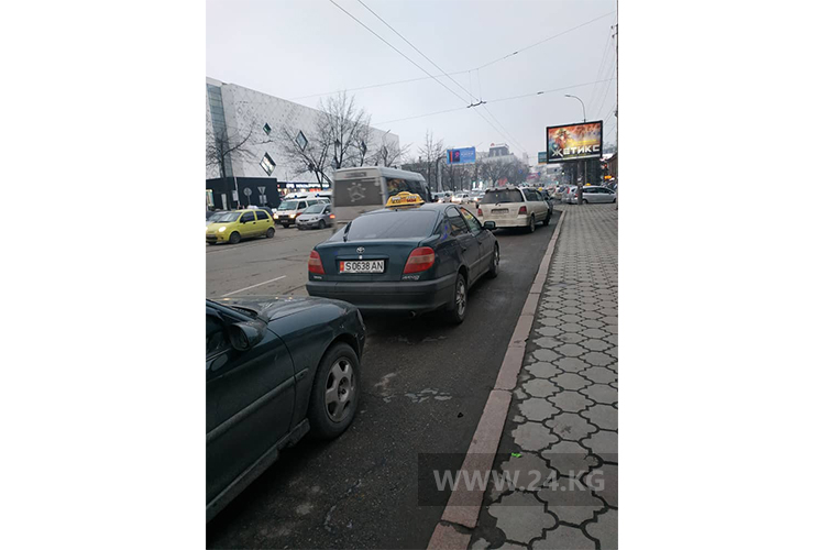 Таксисты — злостные нарушители правил парковки. Очередной водитель встал на перекрестке улицы Ахунбаева и проспекта Айтматова.
