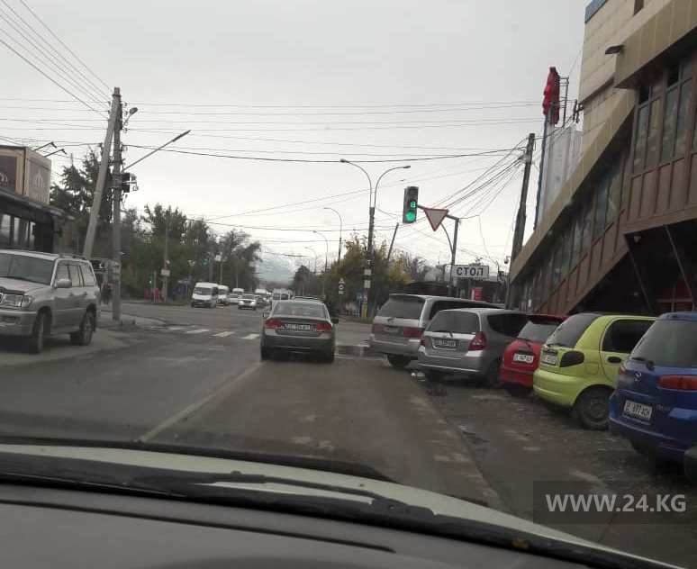 На перекрестке улицы Алыкулова и проспекта Дэн Сяопина в Бишкеке из-за припаркованных автомобилей возле магазина «Народный» водителям приходится нарушать Правила дорожного движения. Об этом 24-kg.com сообщил читатель.