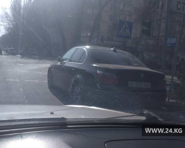 На перекрестке улиц Боконбаева и Тыныстанова припарковали BMW. Авто мешает другим водителям.