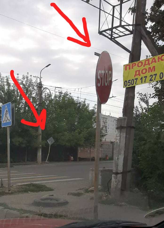 «Знак «Стоп» висит на одном болту, а знак «Главная дорога» вырван с корнем и просто держится на честном слове. Позвонил в СМЭУ, но они только по светофорам. Куда обращаться, так и не нашел», написал он.