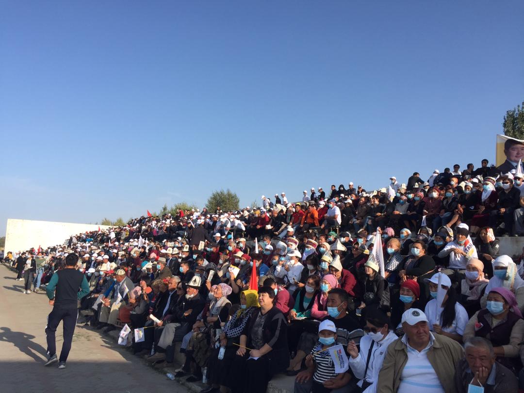 Партия «Мекеним Кыргызстан» собрала на ипподроме в Сокулуке несколько тысяч человек. При этом многие присутствующие без масок, также никто не соблюдает дистанцию. Об этом сообщают в социальных сетях.