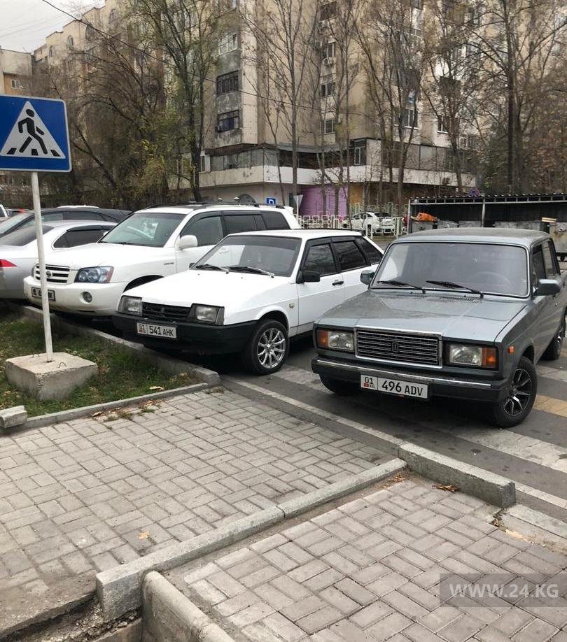 В районе пересечения улиц Усенбаева и Боконбаева авто припарковали прямо на пешеходной дорожке.