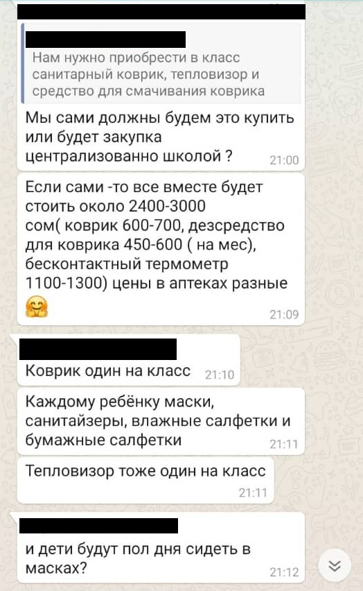 «Одна из участниц группы сразу подсчитала, сколько будет стоить покупка всего необходимого, это 2 тысячи 400 — 3 тысячи сомов. Коврик — 600-700 сомов, дезсредство для коврика — 450-600 (на месяц), бесконтактный термометр — 1 тысяча 100 — 1 тысяча 300 сомов. Тепловизор стоит около 5 тысяч сомов, можно ведь взять бесконтактный термометр, он стоит до 1 тысячи 300 сомов», — цитирует переписку в классной группе читательница.