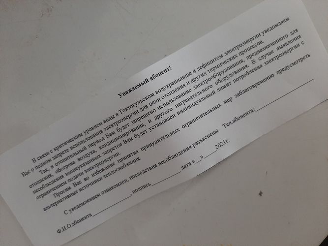 В записке сказано, что такие меры предпринимают из-за критического уровня воды в Токтогульском водохранилище и дефицита электроэнергии.