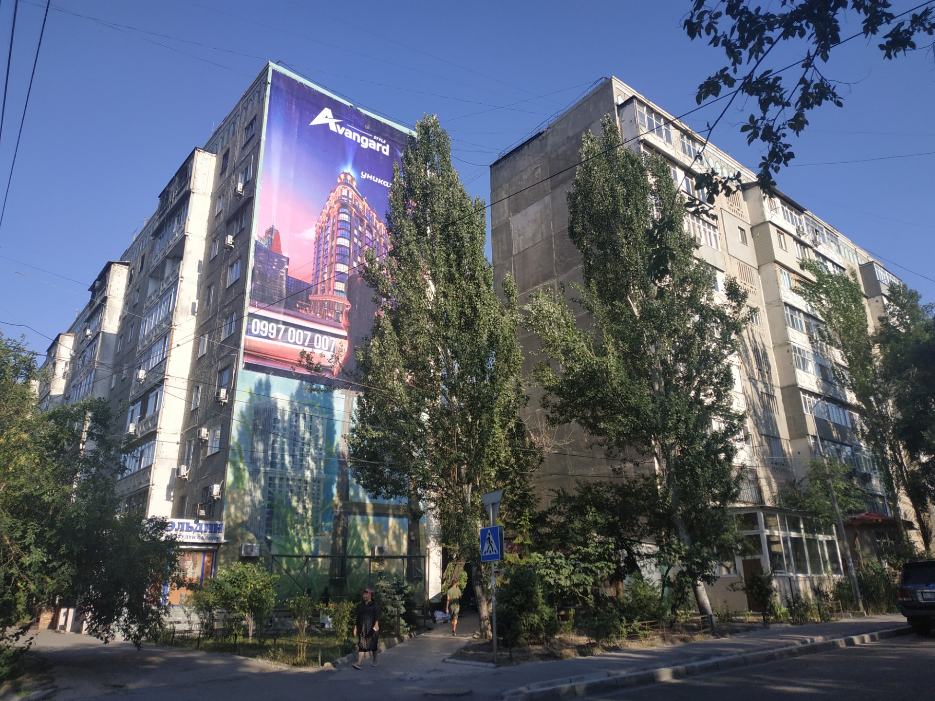В центре Бишкека мурал на многоэтажном доме закрыли рекламным баннером. Об этом 24-kg.com сообщил читатель.