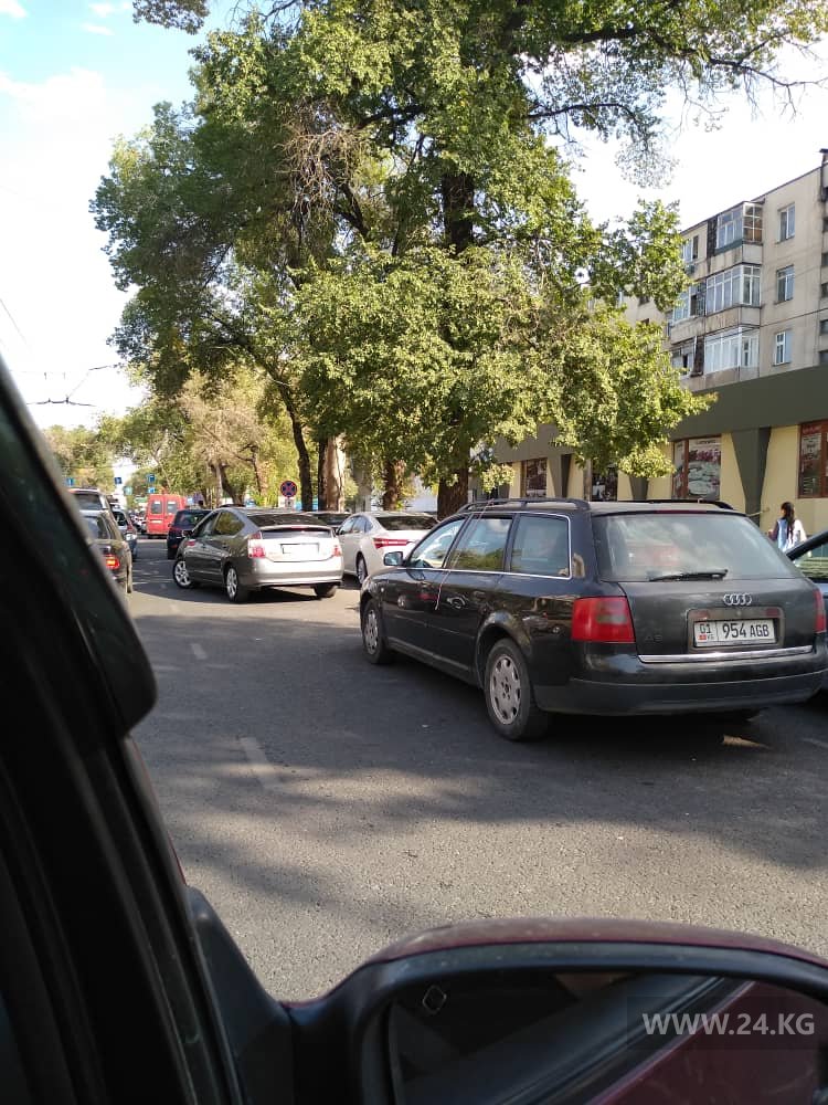 На пересечении улицы Боконбаева и бульвара Эркиндик машину оставили на перекрестке. «Просто припарковали, заняв ряд поворачивающих направо и вниз. Это так можно, вообще?» — написал автор снимка.