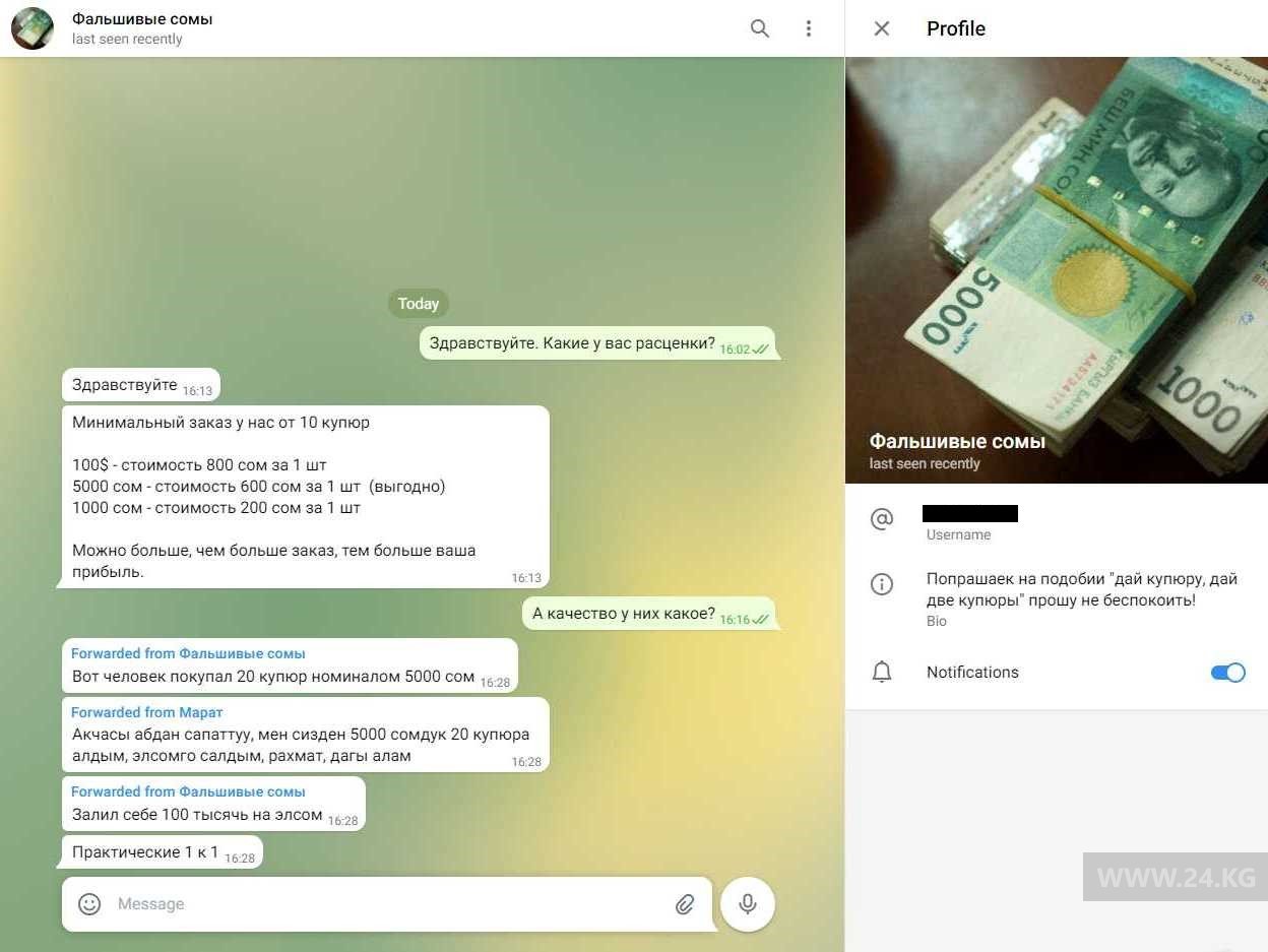В мессенджере Telegram неизвестные предлагают кыргызстанцам купить фальшивые сомы и доллары. Об этом 24-kg.com сообщил читатель.