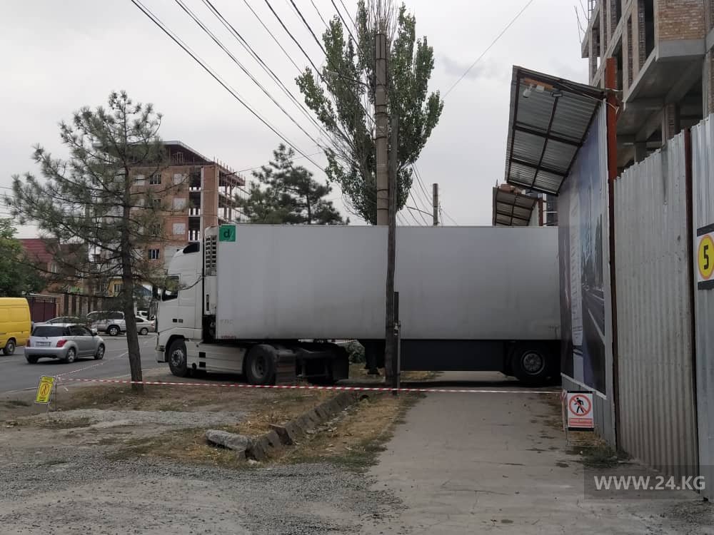 В Бишкеке на улице Юнусалиева ниже ее пересечения с улицей Ахунбаева водитель большегрузной машины полностью перегородил проход по тротуару.