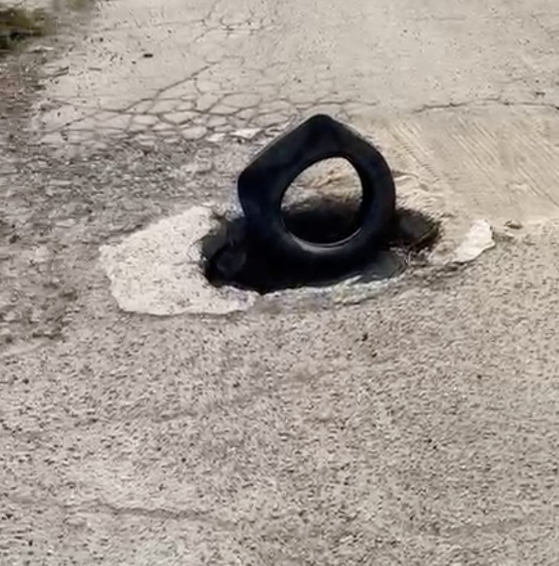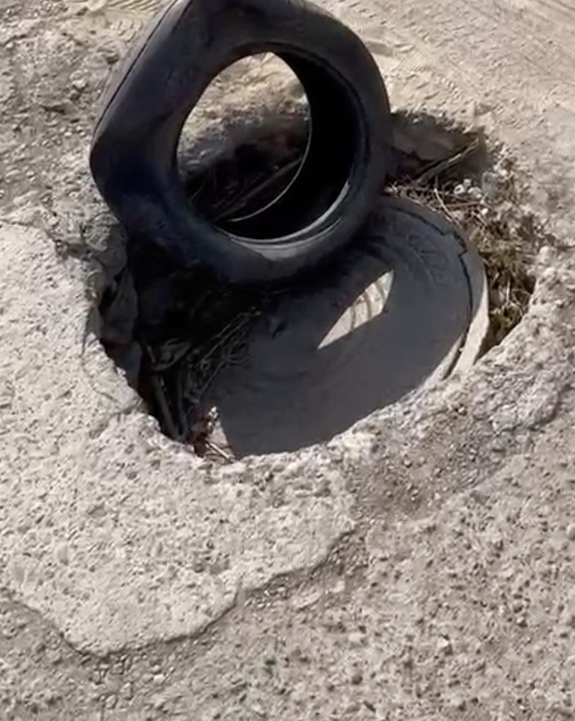 По его словам, в этой яме часто застревают машины и жителям домов пришлось поставить на нее резиновое колесо для видимости.