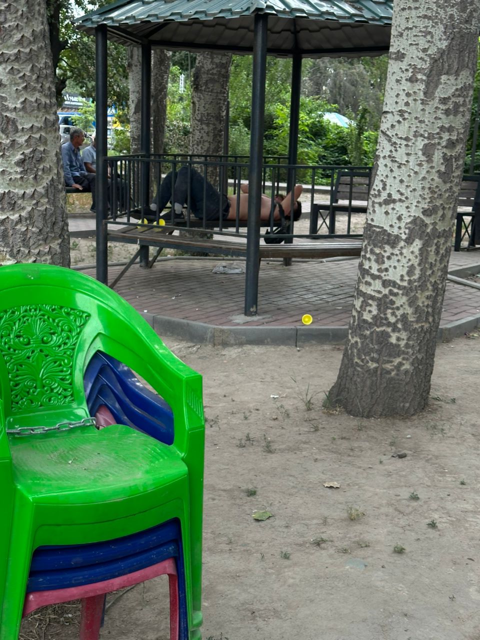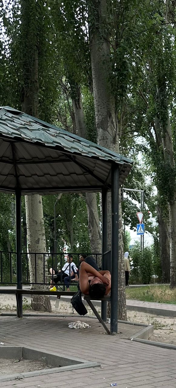 Мужчина лежал в беседке без футболки, на его шее висела черная барсетка. По словам читателя, это было примерно в 17.00-18.00. Возле беседки в парке играют дети, а на скамейках отдыхают горожане.